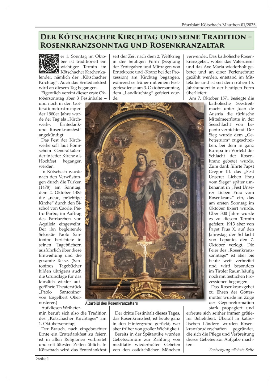 Der Altar auf der linken Seite im Gailtaler Dom ist der Heiligen Mutter Anna geweiht, der rechte der Königin des Rosenkranzes. Der Rosenkranzaltar gehörte zur Rosenkranzbruderschaft, die 1664 in Kötschach gegründet wurde und dort mehr als 100 Jahre lang aktiv war. Der heutige Altar stammt aus dem Jahr 1768. Er wurde von den Bewohnern der deutschsprachigen Insel Timau gestiftet. Noch heute pilgern die Einwohner von Timau nach Kötschach um das Rosenkranzfest am ersten Sonntag im Oktober zu feiern.